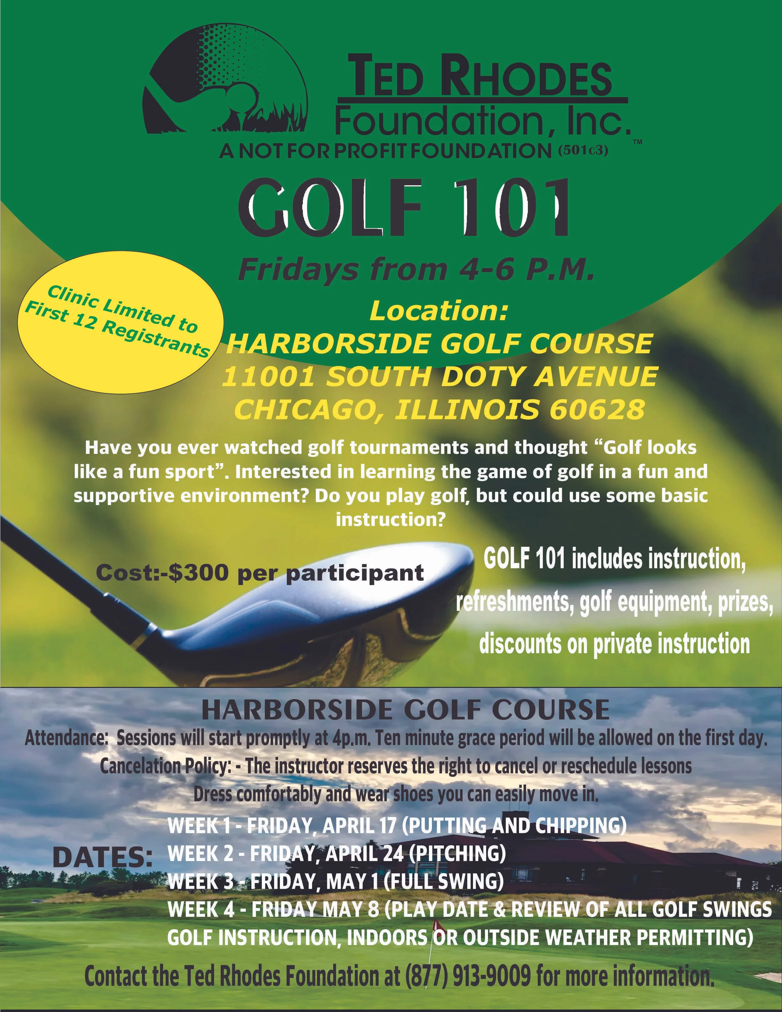 Golf 101 includes instruction, refreshments, golf equipment, prizes, and discounts on private instruction.
